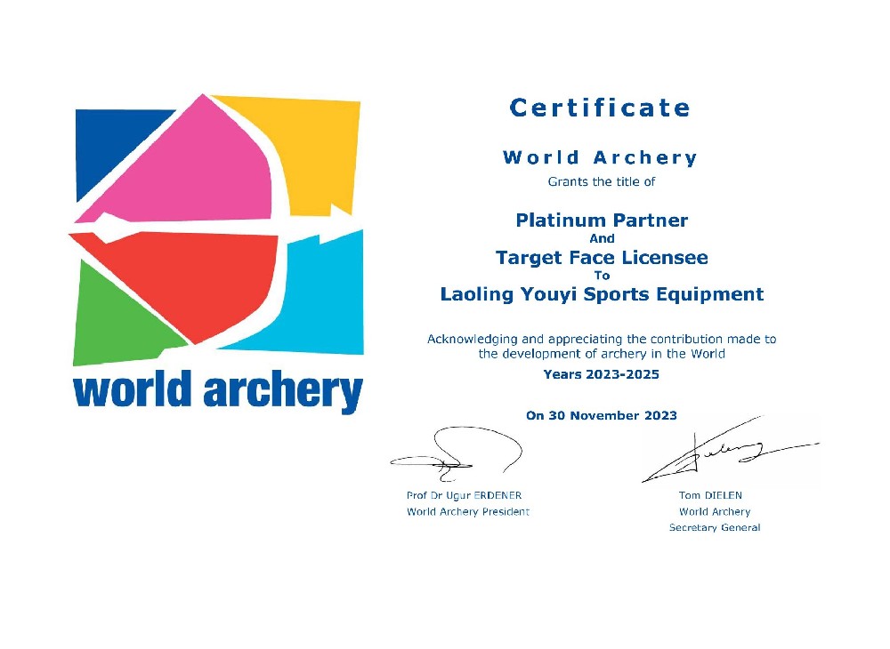 目前,主要生產(chǎn)和銷售射箭比賽及訓練專用器材,包括:箭靶、靶紙、靶架、號碼牌、風向旗、計時記分器等場地器材設(shè)備;反曲弓、復合弓、傳統(tǒng)弓、瞄準器、防震桿等弓箭裝備;箭壺、護胸、護臂、護指等各類箱包護具。公司所生產(chǎn)的射箭器材已通過國際射箭聯(lián)合會及中國射箭協(xié)會CAA認證。